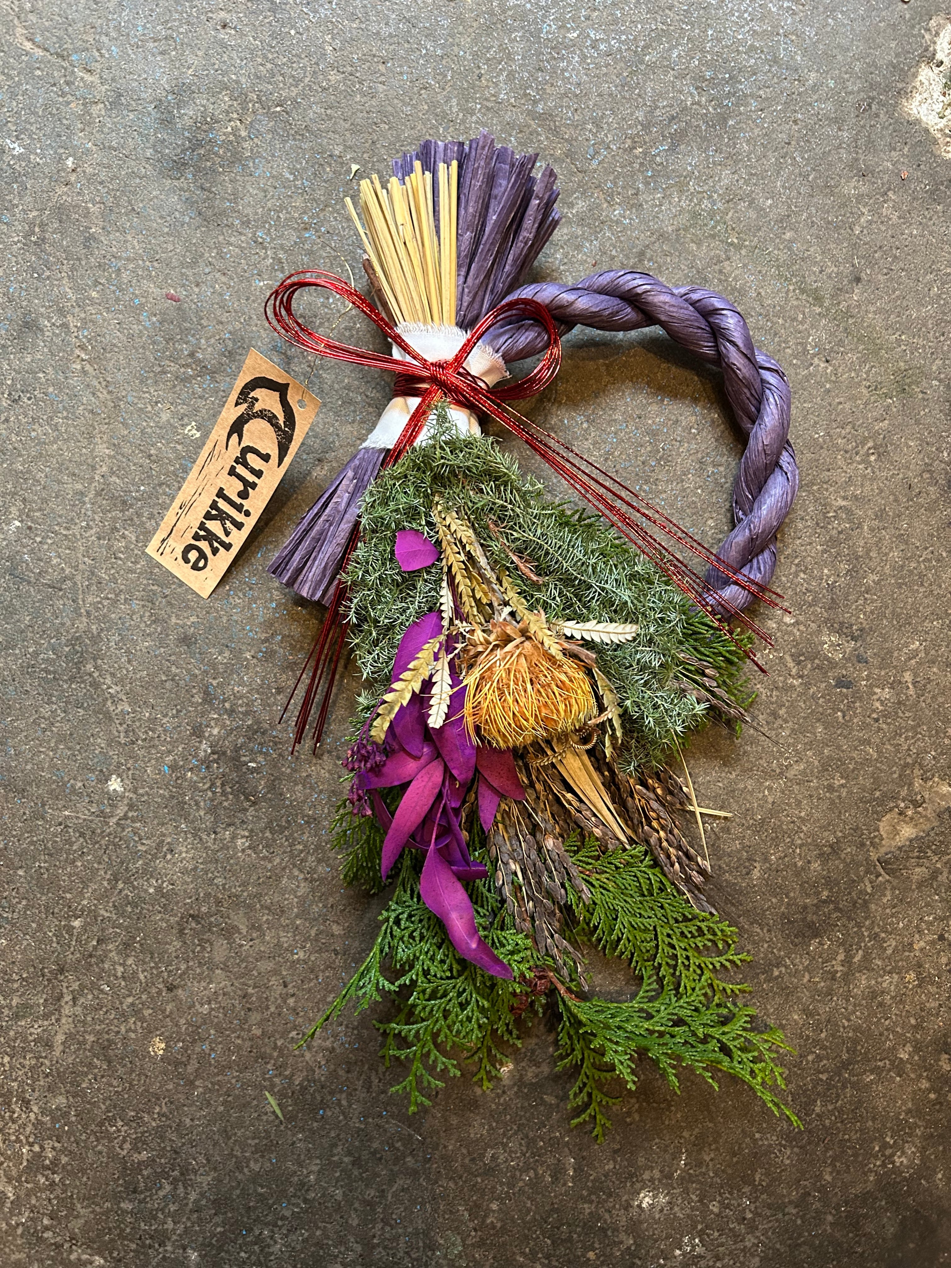 パープルラフィアを使ってちょっとポップな感じのお飾りを作りました。