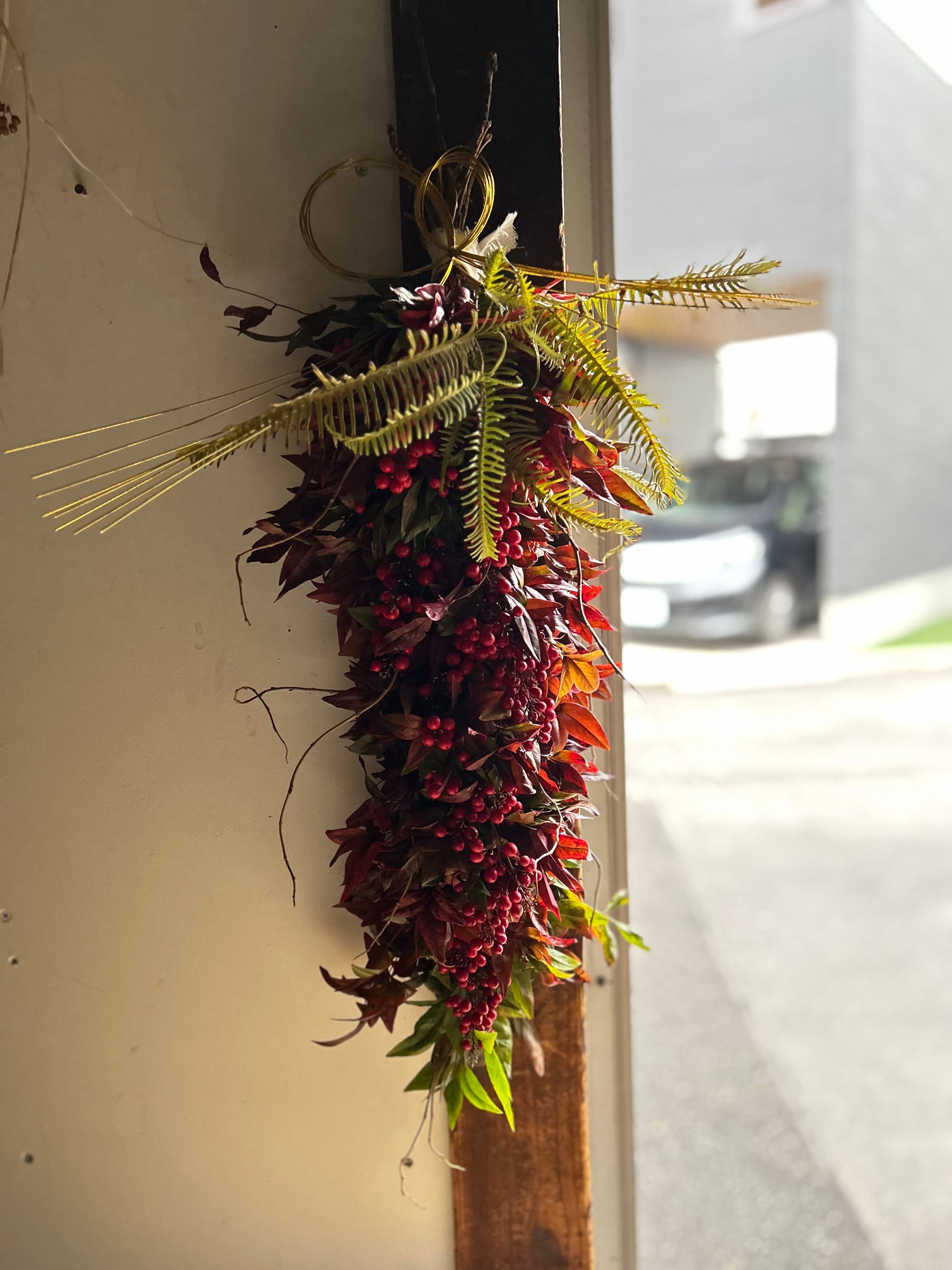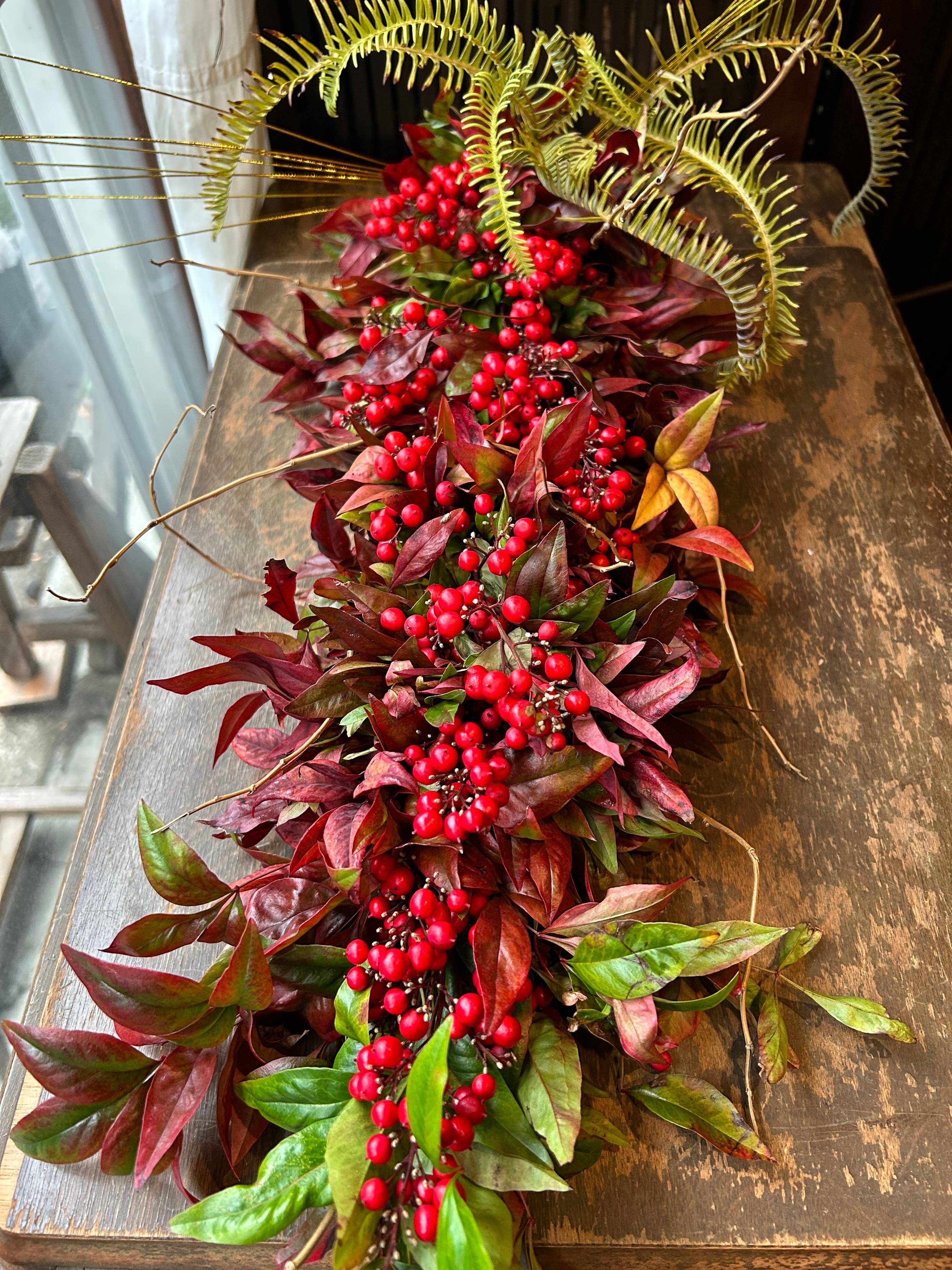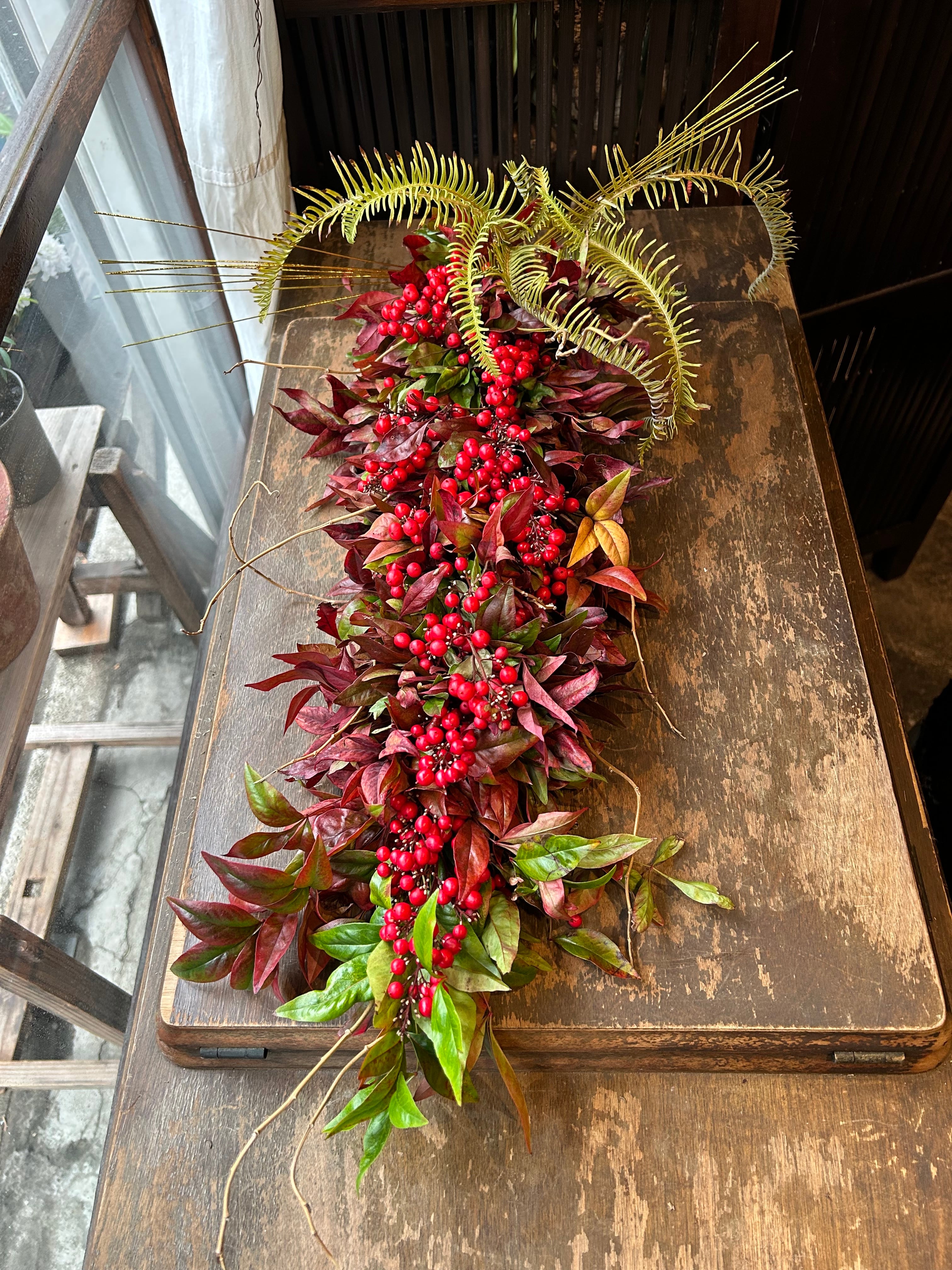 南天の実をたっぷり使って赤いガーランドを作りました。お正月飾りとして、そのあとは水引を取ってお部屋に飾っても良いかと思います。